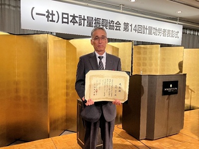 計量功労者表彰式では、当協会前副会長の宗形信二氏が日本製鉄(株)東日本製鉄所鹿島地区における製品の製造に係る計測機器等の管理・整備業務と、長年にわたる当協会運営に尽力された功績が認められ、日本計量振興協会長から表彰状が授与されました。