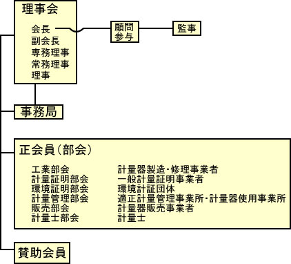 協会は、正会員、賛助会員により組織され、6つの部会(工業部会、計量証明部会、環境証明部会、計量管理部会、販売部会、計量士部会)を中心として活動を行います。 事務局は、茨城県計量検定所庁舎内に置かれています。